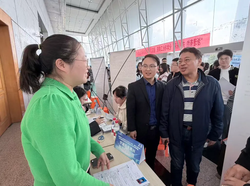 化学与化工学院党委书记施鹏、党委副书记王勇能一行来到招聘会现场,和企业代表、到场学生亲切交流。