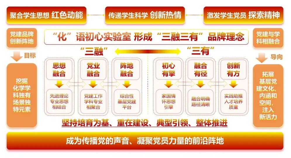 化学与化工学院党委打造“化”语初心实验室党建品牌,深度挖掘化学学科中的独有场景和独特元素,以实验室为党建品牌创新阵地,将党建主题与学科专业相融合,拓展基层党建的文化内涵和空间,为基层党建注入新的活力。“化”语初心实验室坚持培育为基、重在建设、典型引领、整体推进,使实验室成为传播党的声音、凝聚党员力量的前沿阵地,形成了“三融三有”品牌理念。