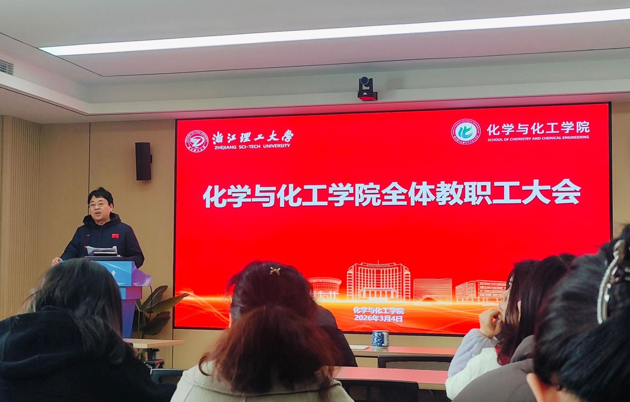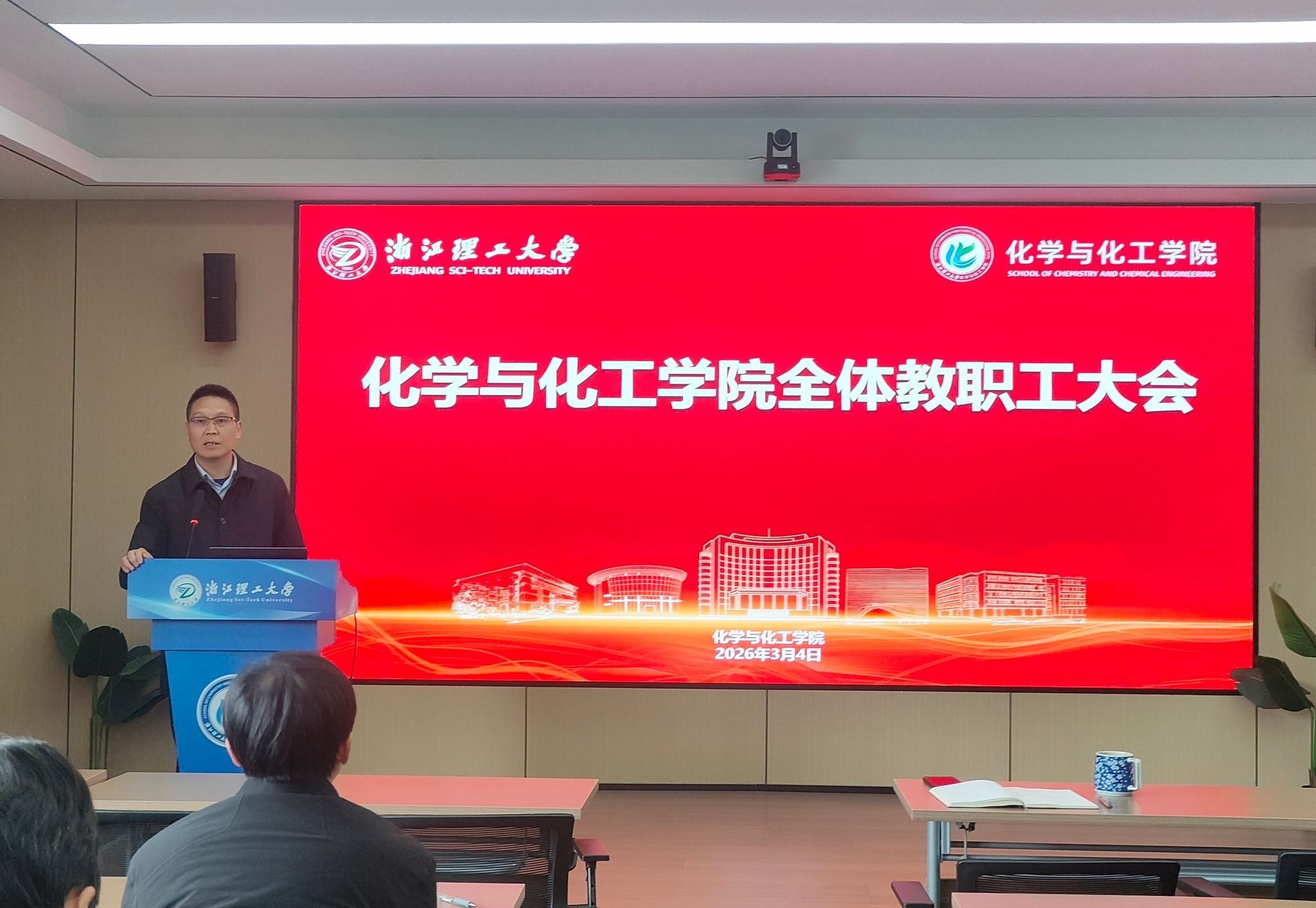 2026年3月4日下午,化学与化工学院全体教职工大会在19-531报告厅顺利召开。学院全体教职工参加会议。会议由学院党委书记施鹏主持。